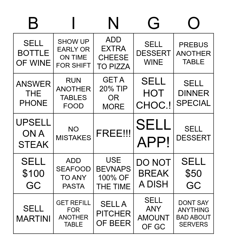 This bingo card has a free space and 24 words: ADD SEAFOOD TO ANY PASTA, GET REFILL FOR ANOTHER TABLE, GET A 20% TIP OR MORE, SELL MARTINI, PREBUS ANOTHER TABLE, SELL BOTTLE OF WINE, ANSWER THE PHONE, SHOW UP EARLY OR ON TIME FOR SHIFT, SELL APP!, USE BEVNAPS 100% OF THE TIME, SELL HOT CHOC.!, UPSELL ON A STEAK, DO NOT BREAK A DISH, SELL $50 GC, RUN ANOTHER TABLES FOOD, SELL ANY AMOUNT OF GC, SELL DESSERT, ADD EXTRA CHEESE TO PIZZA, SELL DINNER SPECIAL, NO MISTAKES, DONT SAY ANYTHING BAD ABOUT SERVERS, SELL $100 GC, SELL DESSERT WINE and SELL A PITCHER OF BEER.