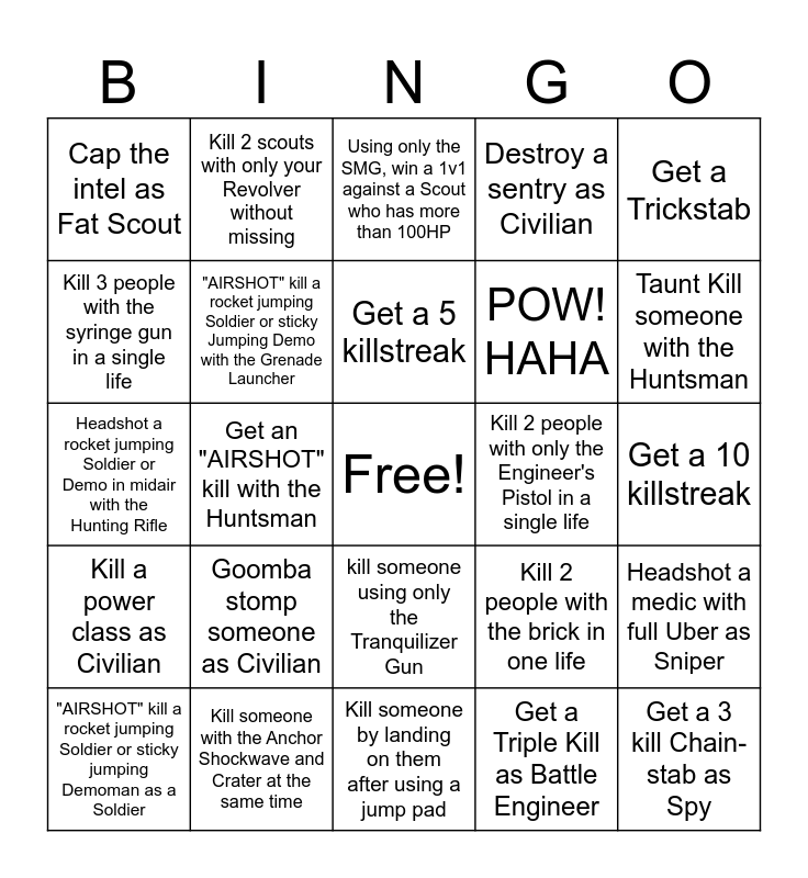 This bingo card has a free space and 24 words: Goomba stomp someone as Civilian, Kill someone with the Anchor Shockwave and Crater at the same time, Get a 5 killstreak, "AIRSHOT" kill a rocket jumping Soldier or sticky jumping Demoman as a Soldier, Get a Trickstab, Cap the intel as Fat Scout, Kill 3 people with the syringe gun in a single life, Kill 2 scouts with only your Revolver without missing, Kill 2 people with only the Engineer's Pistol in a single life, kill someone using only the Tranquilizer Gun, POW! HAHA, Headshot a rocket jumping Soldier or Demo in midair with the Hunting Rifle, Kill 2 people with the brick in one life, Headshot a medic with full Uber as Sniper, "AIRSHOT" kill a rocket jumping Soldier or sticky Jumping Demo with the Grenade Launcher, Get a Triple Kill as Battle Engineer, Get a 10 killstreak, Using only the SMG, win a 1v1 against a Scout who has more than 100HP, Taunt Kill someone with the Huntsman, Get an "AIRSHOT" kill with the Huntsman, Get a 3 kill Chain-stab as Spy, Kill a power class as Civilian, Destroy a sentry as Civilian and Kill someone by landing on them after using a jump pad.