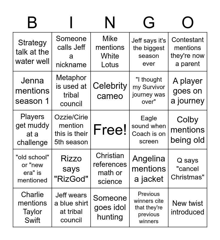 This bingo card has a free space and 24 words: Rizzo says "RizGod", Jeff wears a blue shirt at tribal council, Celebrity cameo, Charlie mentions Taylor Swift, Contestant mentions they're now a parent, Strategy talk at the water well, Jenna mentions season 1, Someone calls Jeff a nickname, Eagle sound when Coach is on screen, Christian references math or science, "I thought my Survivor journey was over", Players get muddy at a challenge, Angelina mentions a jacket, Q says "cancel Christmas", Metaphor is used at tribal council, Previous winners cite that they're previous winners, Colby mentions being old, Mike mentions White Lotus, A player goes on a journey, Ozzie/Cirie mention this is their 5th season, New twist introduced, "old school" or "new era" is mentioned, Jeff says it's the biggest season ever and Someone goes idol hunting.