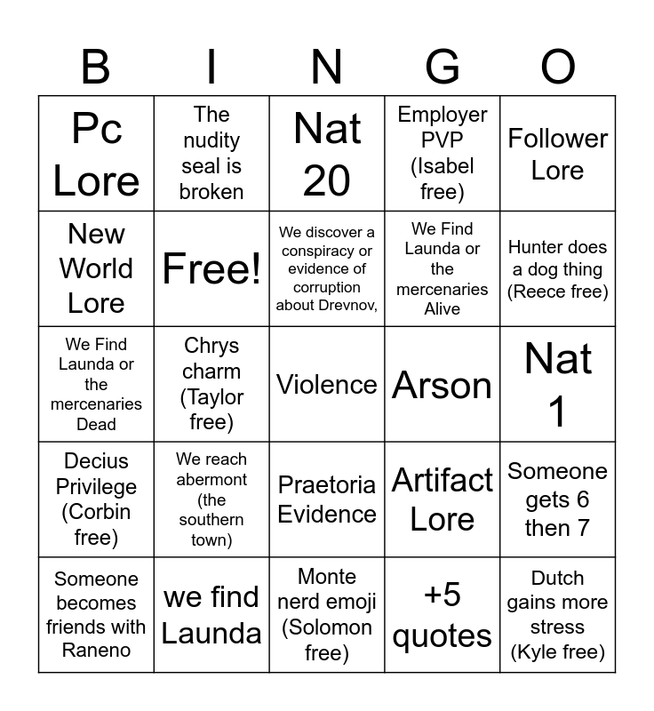 This bingo card has a free space and 24 words: We reach abermont (the southern town), we find Launda, We discover a conspiracy or evidence of corruption about Drevnov,, Someone becomes friends with Raneno, Follower Lore, Pc Lore, New World Lore, The nudity seal is broken, Arson, Praetoria Evidence, We Find Launda or the mercenaries Alive, We Find Launda or the mercenaries Dead, Artifact Lore, Someone gets 6 then 7, Free!, +5 quotes, Nat 1, Nat 20, Hunter does a dog thing (Reece free), Chrys charm (Taylor free), Dutch gains more stress (Kyle free), Decius Privilege (Corbin free), Employer PVP (Isabel free) and Monte nerd emoji (Solomon free).