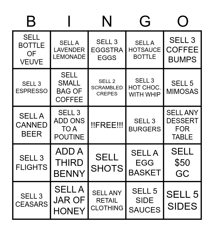This bingo card has a free space and 24 words: ADD A THIRD BENNY, SELL A JAR OF HONEY, SELL 2 SCRAMBLED CREPES, SELL 3 CEASARS, SELL 3 COFFEE BUMPS, SELL BOTTLE OF VEUVE, SELL 3 ESPRESSO, SELL A LAVENDER LEMONADE, SELL 3 BURGERS, SELL SHOTS, SELL 3 HOT CHOC. WITH WHIP, SELL A CANNED BEER, SELL A EGG BASKET, SELL $50 GC, SELL SMALL BAG OF COFFEE, SELL 5 SIDE SAUCES, SELL ANY DESSERT FOR TABLE, SELL 3 EGGSTRA EGGS, SELL 5 MIMOSAS, SELL 3 ADD ONS TO A POUTINE, SELL 5 SIDES, SELL 3 FLIGHTS, SELL A HOTSAUCE BOTTLE and SELL ANY RETAIL CLOTHING.