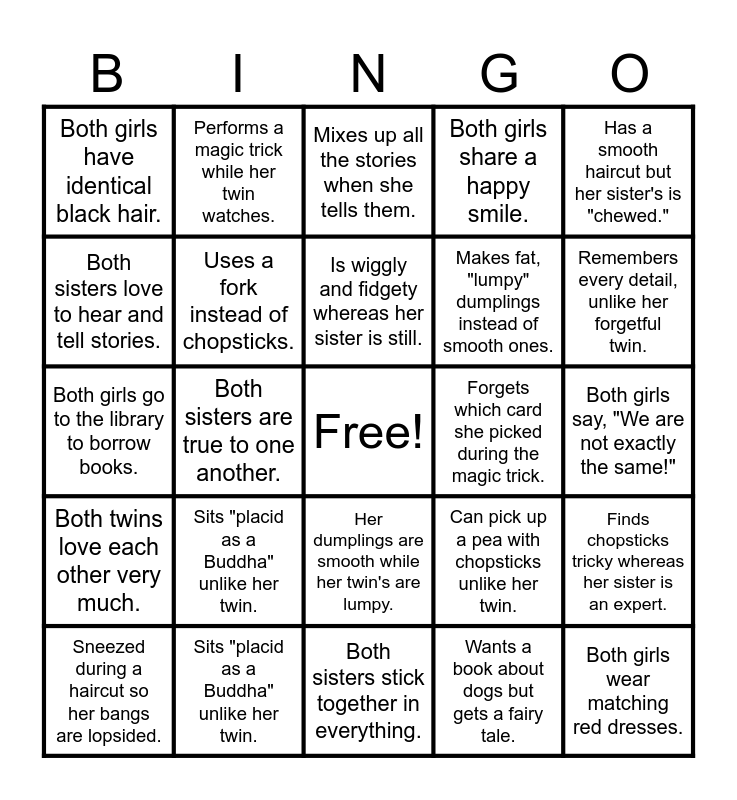 This bingo card has a free space and 24 words: Sits "placid as a Buddha" unlike her twin., Sits "placid as a Buddha" unlike her twin., Is wiggly and fidgety whereas her sister is still., Sneezed during a haircut so her bangs are lopsided., Has a smooth haircut but her sister's is "chewed.", Both girls have identical black hair., Both sisters love to hear and tell stories., Performs a magic trick while her twin watches., Forgets which card she picked during the magic trick., Her dumplings are smooth while her twin's are lumpy., Makes fat, "lumpy" dumplings instead of smooth ones., Both girls go to the library to borrow books., Can pick up a pea with chopsticks unlike her twin., Finds chopsticks tricky whereas her sister is an expert., Uses a fork instead of chopsticks., Wants a book about dogs but gets a fairy tale., Both girls say, "We are not exactly the same!", Mixes up all the stories when she tells them., Remembers every detail, unlike her forgetful twin., Both sisters are true to one another., Both girls wear matching red dresses., Both twins love each other very much., Both girls share a happy smile. and Both sisters stick together in everything..