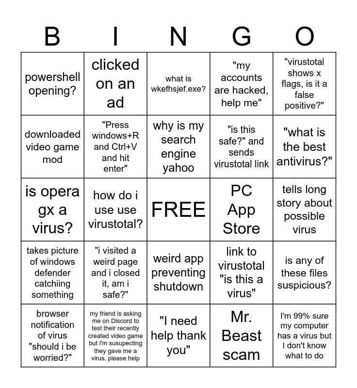 This bingo card has a free space and 24 words: "i visited a weird page and i closed it, am i safe?", my friend is asking me on Discord to test their recently created video game but I'm susupecting they gave me a virus, please help, why is my search engine yahoo, browser notification of virus "should i be worried?", "virustotal shows x flags, is it a false positive?", powershell opening?, downloaded video game mod, clicked on an ad, PC App Store, weird app preventing shutdown, "is this safe?" and sends virustotal link, is opera gx a virus?, link to virustotal "is this a virus", is any of these files suspicious?, "Press windows+R and Ctrl+V and hit enter", Mr. Beast scam, tells long story about possible virus, what is wkefhsjef.exe?, "what is the best antivirus?", how do i use use virustotal?, I'm 99% sure my computer has a virus but I don't know what to do, takes picture of windows defender catchiing something, "my accounts are hacked, help me" and "I need help thank you".