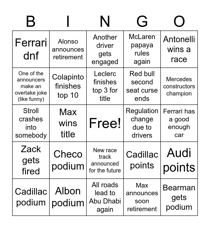 This bingo card has a free space and 24 words: Cadillac podium, Checo podium, Leclerc finishes top 3 for title, Max announces soon retirement, Antonelli wins a race, Ferrari dnf, Alonso announces retirement, Another driver gets engaged, Regulation change due to drivers, Ferrari has a good enough car, Stroll crashes into somebody, Colapinto finishes top 10, Cadillac points, Audi points, One of the announcers make an overtake joke (like funny), Albon podium, All roads lead to Abu Dhabi again, McLaren papaya rules again, Mercedes constructors champion, Zack gets fired, Max wins title, New race track announced for the future, Red bull second seat curse ends and Bearman gets podium.