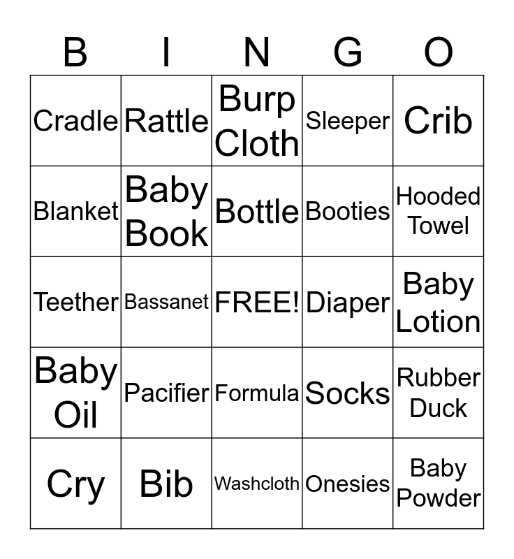 This bingo card has a free space and 24 words: Pacifier, Bib, Bottle, Cry, Crib, Cradle, Blanket, Rattle, Diaper, Formula, Booties, Teether, Socks, Rubber Duck, Baby Book, Onesies, Baby Lotion, Burp Cloth, Hooded Towel, Bassanet, Baby Powder, Baby Oil, Sleeper and Washcloth.