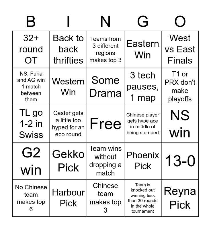 This bingo card has a free space and 24 words: No Chinese team makes top 6, Gekko Pick, Some Drama, Team is knocked out winning less than 30 rounds in the whole tournament, West vs East Finals, 32+ round OT, Back to back thrifties, Teams from 3 different regions makes top 3, Chinese player gets hype ace in middle of being stomped, NS win, TL go 1-2 in Swiss, Western Win, Phoenix Pick, 13-0, NS, Furia and AG win 1 match between them, Harbour Pick, Chinese team makes top 3, Eastern Win, T1 or PRX don't make playoffs, G2 win, Caster gets a little too hyped for an eco round, Team wins without dropping a match, 3 tech pauses, 1 map and Reyna Pick.