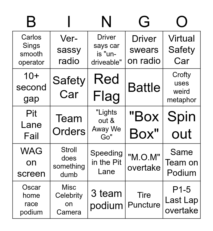 This bingo card has a free space and 36 words: Papaya Rules is mentioned, Lap 1 collision, DNF, Safety Car, "M.O.M" overtake, WAG on screen, Red Flag, Track Limits Penalty, Virtual Safety Car, 2+ Car Crash, Team Orders, Driver swears on radio, Driver complains about strategy, "Box Box", Crofty uses weird metaphor, Carlos Sings smooth operator, Ferrari Strategy Fail, Stroll does something dumb, P1-5 Last Lap overtake, Driver says car is "un-driveable", Spin out, Same Team on Podium, Misc Celebrity on Camera, Oscar home race podium, 3 team podium, Ver-sassy radio, Pit Lane Fail, Cadillac points, Battle, 10+ second gap, Stall on Start, Pit Wall on Camera, Tire Puncture, Speeding in the Pit Lane, Ferrari mentions Plan A-C and Car touches barrier.