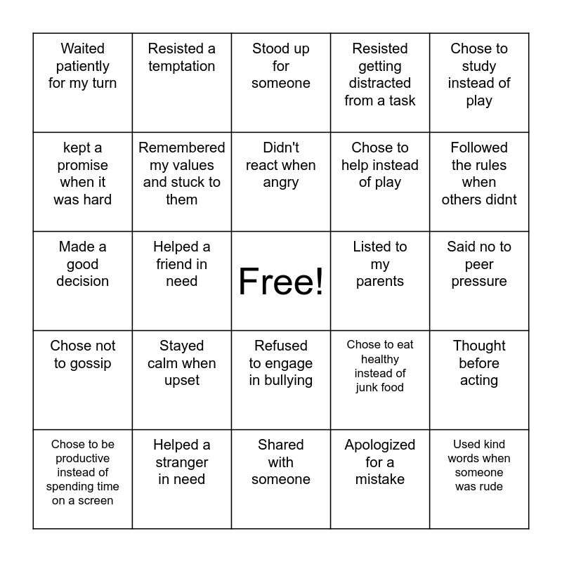 This bingo card has a free space and 24 words: Stayed calm when upset, Helped a stranger in need, Didn't react when angry, Chose to be productive instead of spending time on a screen, Chose to study instead of play, Waited patiently for my turn, kept a promise when it was hard, Resisted a temptation, Listed to my parents, Refused to engage in bullying, Chose to help instead of play, Made a good decision, Chose to eat healthy instead of junk food, Thought before acting, Remembered my values and stuck to them, Apologized for a mistake, Said no to peer pressure, Stood up for someone, Followed the rules when others didnt, Helped a friend in need, Used kind words when someone was rude, Chose not to gossip, Resisted getting distracted from a task and Shared with someone.