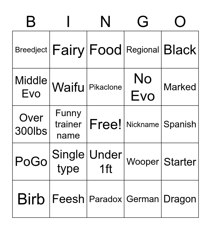 This bingo card has a free space and 24 words: Birb, Single type, Pikaclone, German, Black, Breedject, Fairy, Food, Nickname, Spanish, Over 300lbs, Waifu, Wooper, Starter, Middle Evo, Feesh, Paradox, Regional, Marked, PoGo, Funny trainer name, Under 1ft, No Evo and Dragon.