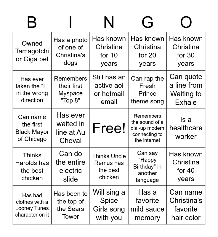 This bingo card has a free space and 24 words: Can do the entire electric slide, Has been to the top of the Sears Tower, Still has an active aol or hotmail email, Has had clothes with a Looney Tunes character on it, Has known Christina for 30 years, Owned Tamagotchi or Giga pet, Has ever taken the "L" in the wrong direction, Has a photo of one of Christina's dogs, Remembers the sound of a dial-up modem connecting to the internet, Thinks Uncle Remus has the best chicken, Can rap the Fresh Prince theme song, Can name the first Black Mayor of Chicago, Can say "Happy Birthday" in another language, Has known Christina for 40 years, Remembers their first Myspace "Top 8", Has a favorite mild sauce memory, Is a healthcare worker, Has known Christina for 10 years, Can quote a line from Waiting to Exhale, Has ever waited in line at Au Cheval, Can name Christina's favorite hair color, Thinks Harolds has the best chicken, Has known Christina for 20 years and Will sing a Spice Girls song with you.