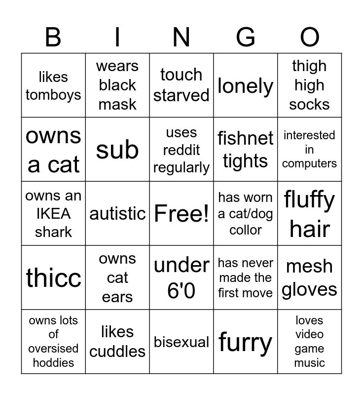 This bingo card has a free space and 24 words: owns cat ears, likes cuddles, uses reddit regularly, owns lots of oversised hoddies, thigh high socks, likes tomboys, owns a cat, wears black mask, has worn a cat/dog collor, under 6'0, fishnet tights, owns an IKEA shark, has never made the first move, mesh gloves, sub, furry, fluffy hair, touch starved, interested in computers, autistic, loves video game music, thicc, lonely and bisexual.