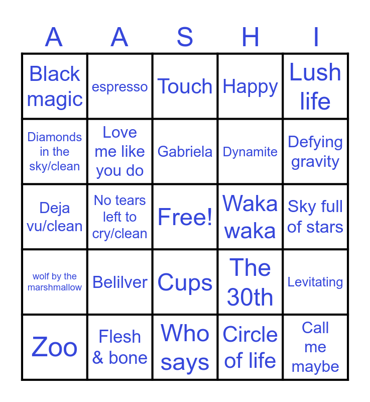 This bingo card has a free space and 33 words: Apt, Popular, No tears left to cry/clean, blinding lights/clean, wolf by the marshmallow, Love me like you do, Lush life, Zoo, espresso, Beautiful things, Gabriela, Touch, Sunroof, Roar, Waka waka, Defying gravity, Flesh & bone, Deja vu/clean, Belilver, The 30th, Cups, Confident, Black magic, Sky full of stars, Who says, Call me maybe, Happy, Dynamite, Diamonds in the sky/clean, Levitating, A new world, Circle of life and Under the sea.