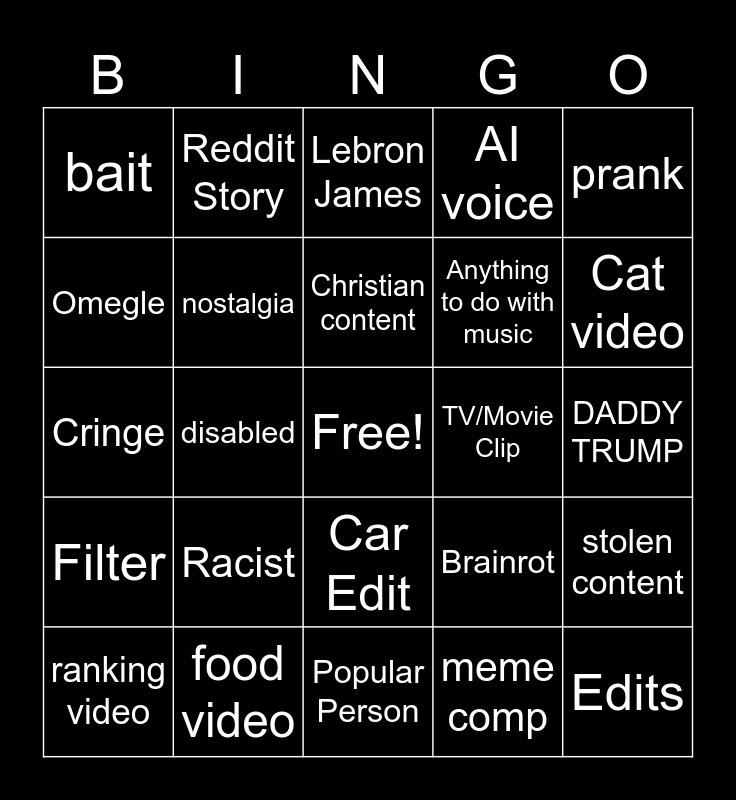This bingo card has a free space and 24 words: Racist, food video, Christian content, ranking video, prank, bait, Omegle, Reddit Story, TV/Movie Clip, Car Edit, Anything to do with music, Cringe, Brainrot, stolen content, nostalgia, meme comp, DADDY TRUMP, Lebron James, Cat video, disabled, Edits, Filter, AI voice and Popular Person.