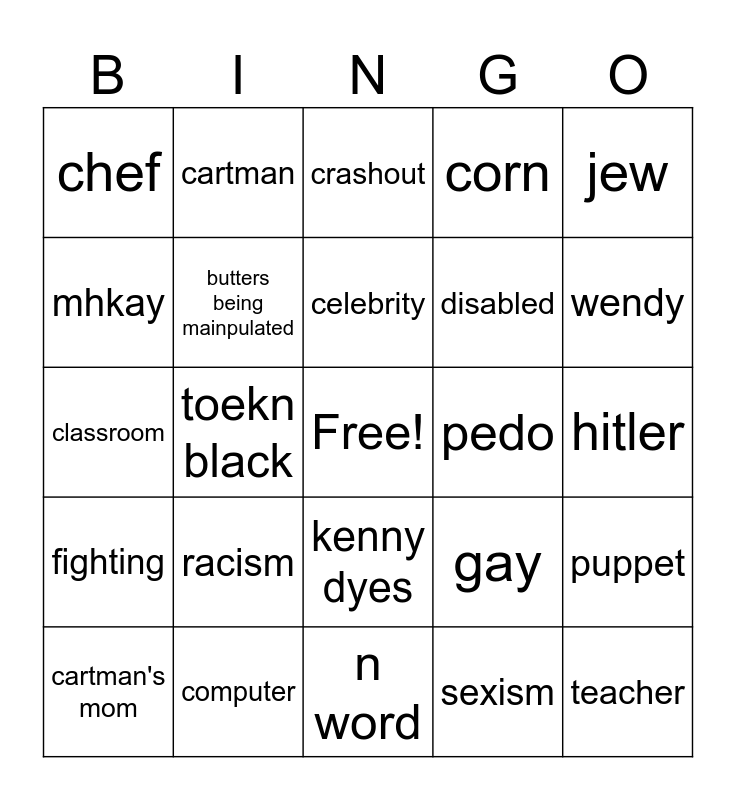This bingo card has a free space and 24 words: racism, computer, celebrity, cartman's mom, jew, chef, mhkay, cartman, pedo, kenny dyes, disabled, classroom, gay, puppet, butters being mainpulated, sexism, hitler, crashout, wendy, toekn black, teacher, fighting, corn and n word.