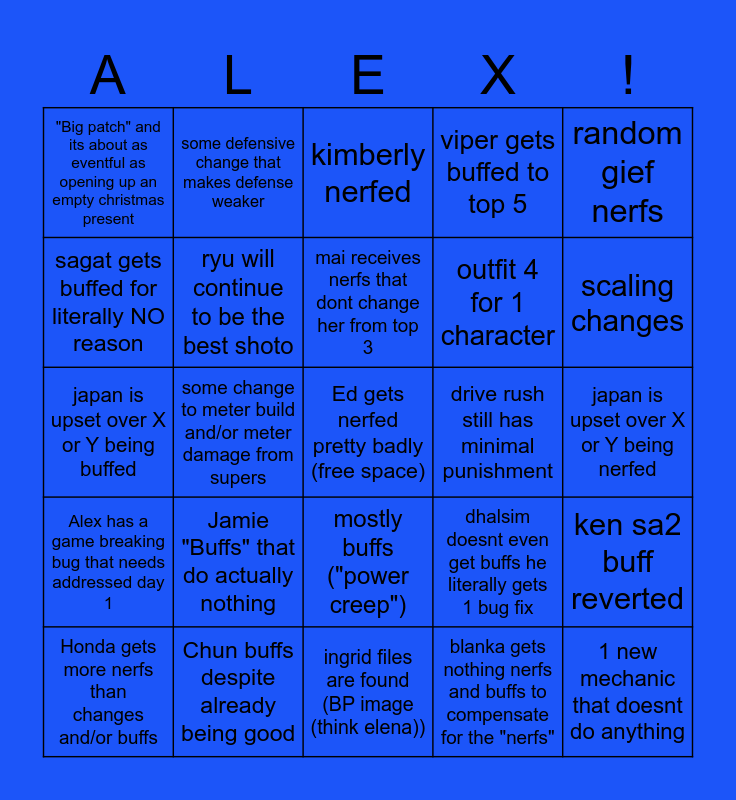This bingo card has a free space and 24 words: Jamie "Buffs" that do actually nothing, Chun buffs despite already being good, mai receives nerfs that dont change her from top 3, Honda gets more nerfs than changes and/or buffs, random gief nerfs, "Big patch" and its about as eventful as opening up an empty christmas present, sagat gets buffed for literally NO reason, some defensive change that makes defense weaker, drive rush still has minimal punishment, mostly buffs ("power creep"), outfit 4 for 1 character, japan is upset over X or Y being buffed, dhalsim doesnt even get buffs he literally gets 1 bug fix, ken sa2 buff reverted, ryu will continue to be the best shoto, blanka gets nothing nerfs and buffs to compensate for the "nerfs", japan is upset over X or Y being nerfed, kimberly nerfed, scaling changes, some change to meter build and/or meter damage from supers, 1 new mechanic that doesnt do anything, Alex has a game breaking bug that needs addressed day 1, viper gets buffed to top 5 and ingrid files are found (BP image (think elena)).