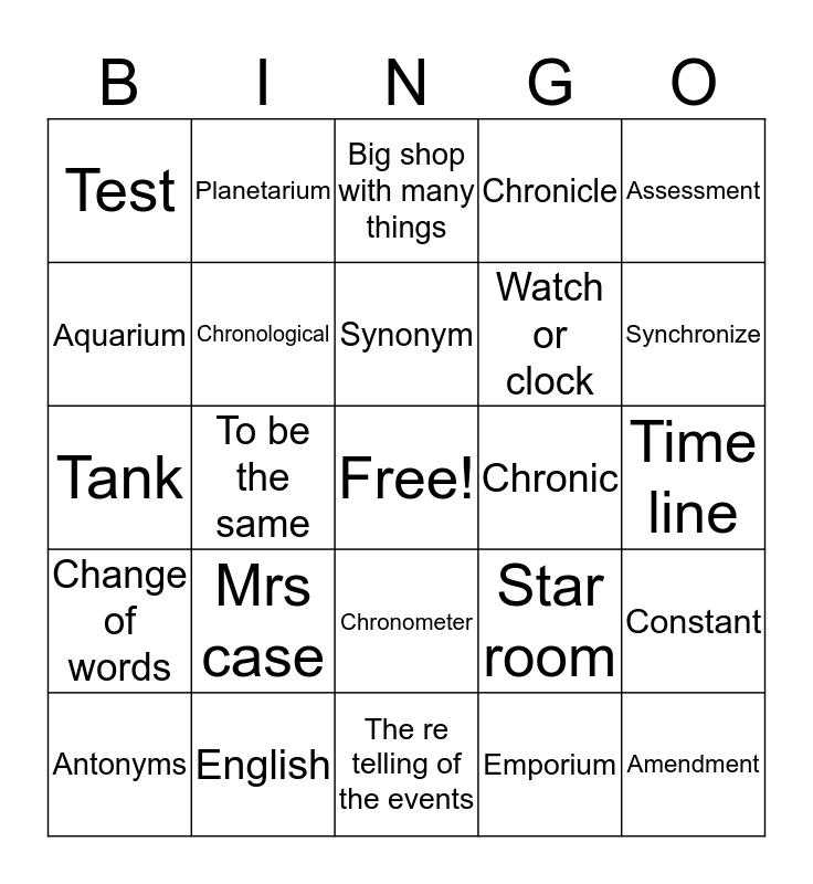 This bingo card has a free space and 24 words: Mrs case, English, Synonym, Antonyms, Assessment, Test, Aquarium, Planetarium, Chronic, Chronometer, Watch or clock, Tank, Star room, Constant, Chronological, Emporium, Time line, Big shop with many things, Synchronize, To be the same, Amendment, Change of words, Chronicle and The re telling of the events.