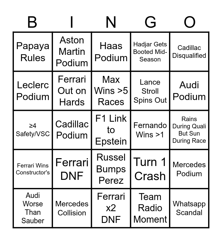 This bingo card has a free space and 24 words: Ferrari DNF, Mercedes Collision, Max Wins >5 Races, Audi Worse Than Sauber, Cadillac Disqualified, Papaya Rules, Leclerc Podium, Aston Martin Podium, Fernando Wins >1, Russel Bumps Perez, Lance Stroll Spins Out, ≥4 Safety/VSC, Turn 1 Crash, Mercedes Podium, Ferrari Out on Hards, Team Radio Moment, Rains During Quali But Sun During Race, Haas Podium, Audi Podium, Cadillac Podium, Whatsapp Scandal, Ferrari Wins Constructor's, Hadjar Gets Booted Mid-Season and Ferrari x2 DNF.