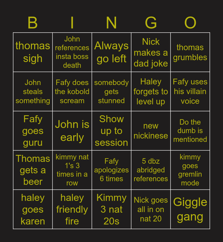 This bingo card has a free space and 24 words: kimmy nat 1's 3 times in a row, haley friendly fire, somebody gets stunned, haley goes karen, thomas grumbles, thomas sigh, John steals something, John references insta boss death, new nickinese, Fafy apologizes 6 times, Haley forgets to level up, Fafy goes guru, 5 dbz abridged references, kimmy goes gremlin mode, Fafy does the kobold scream, Nick goes all in on nat 20, Do the dumb is mentioned, Always go left, Fafy uses his villain voice, John is early, Giggle gang, Thomas gets a beer, Nick makes a dad joke and Kimmy 3 nat 20s.