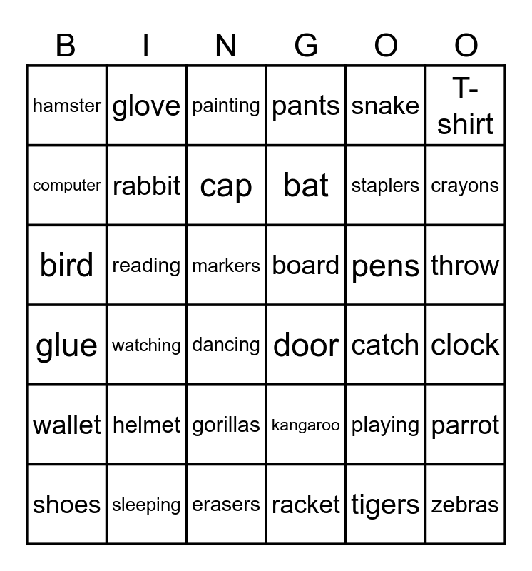 This bingo card has 60 words: desk, door, chair, board, clock, light, computer, trash can, cap, jacket, pants, socks, T-shirt, shoes, sandals, hamster, bird, snake, dog, rabbit, reading, painting, dancing, watching, eating, sleeping, playing, coloring, bat, racket, paddle, baseball, basketball, soccer ball, glove, helmet, rulers, crayons, erasers, staplers, colored pencils, pens, markers, hats, glue, kangaroo, kick, shoot, hit, throw, catch, bounce, zebras, gorillas, parrot, tigers, ostrich, octopus, wallet and homework.