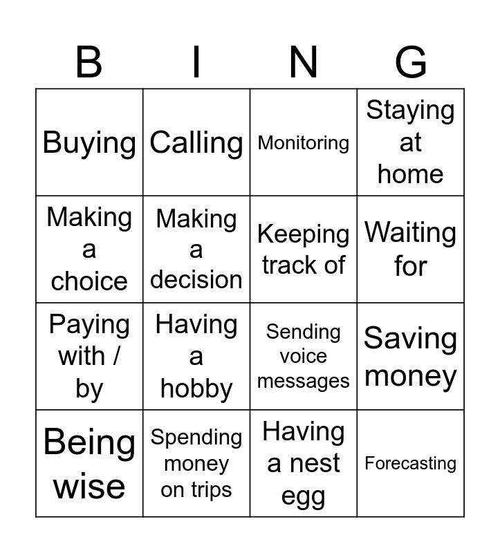 This bingo card has 16 words: Spending money on trips, Saving money, Monitoring, Buying, Paying with / by, Calling, Sending voice messages, Having a nest egg, Making a choice, Making a decision, Being wise, Staying at home, Having a hobby, Waiting for, Keeping track of and Forecasting.