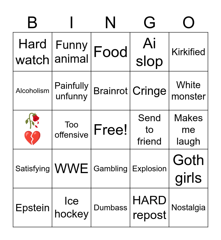 This bingo card has a free space and 24 words: WWE, Ice hockey, Brainrot, Epstein, Kirkified, Hard watch, Alcoholism, Funny animal, Send to friend, Gambling, Cringe, 🥀 💔, Explosion, Goth girls, Painfully unfunny, HARD repost, Makes me laugh, Food, White monster, Too offensive, Nostalgia, Satisfying, Ai slop and Dumbass.