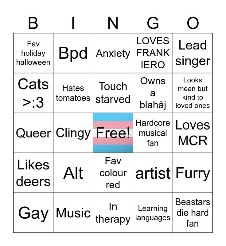 This bingo card has a free space and 24 words: Alt, Music, Touch starved, Gay, Lead singer, Fav holiday halloween, Cats >:3, Bpd, Hardcore musical fan, Fav colour red, Owns a blahåj, Queer, artist, Furry, Hates tomatoes, Learning languages, Loves MCR, Anxiety, Looks mean but kind to loved ones, Clingy, Beastars die hard fan, Likes deers, LOVES FRANK IERO and In therapy.