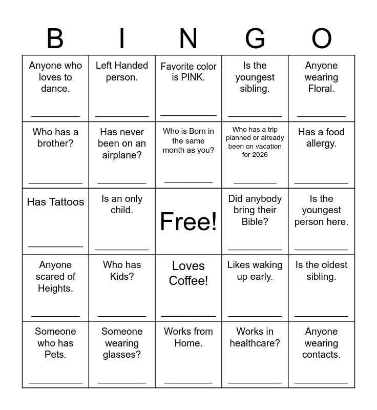 This bingo card has a free space and 24 words: Who has Kids? _________, Someone wearing glasses? _________, Who is Born in the same month as you? ___________, Someone who has Pets. __________, Anyone wearing Floral. _________, Anyone who loves to dance. _________, Who has a brother? __________, Left Handed person. __________, Did anybody bring their Bible? __________, Loves Coffee! ________, Who has a trip planned or already been on vacation for 2026 ___________, Has Tattoos _________, Likes waking up early. __________, Is the oldest sibling. __________, Has never been on an airplane? _________, Works in healthcare? __________, Is the youngest person here. __________, Favorite color is PINK. ___________, Has a food allergy. __________, Is an only child. __________, Anyone wearing contacts. __________, Anyone scared of Heights. _________, Is the youngest sibling. __________ and Works from Home. _________.