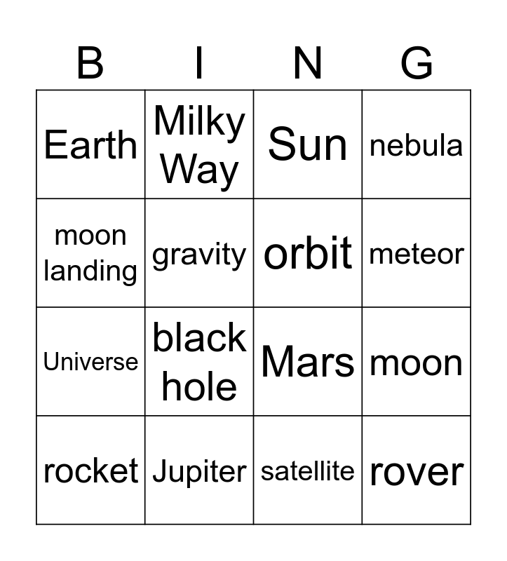 This bingo card has 16 words: Jupiter, moon, Sun, Earth, Universe, Milky Way, Mars, satellite, moon landing, gravity, rocket, nebula, black hole, meteor, orbit and rover.