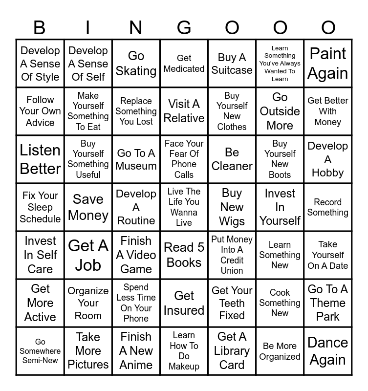 This bingo card has a free space and 48 words: Get Your Teeth Fixed, Go Outside More, Learn How To Do Makeup, Save Money, Go To A Museum, Record Something, Develop A Sense Of Self, Take More Pictures, Learn Something You’ve Always Wanted To Learn, Read 5 Books, Paint Again, Get Medicated, Buy Yourself New Boots, Be Cleaner, Get More Active, Invest In Yourself, Follow Your Own Advice, Get Better With Money, Cook Something New, Buy A Suitcase, Buy Yourself New Clothes, Develop A Routine, Develop A Sense Of Style, Make Yourself Something To Eat, Go To A Theme Park, Replace Something You Lost, Develop A Hobby, Go Somewhere Semi-New, Face Your Fear Of Phone Calls, Buy Yourself Something Useful, Be More Organized, Buy New Wigs, Take Yourself On A Date, Organize Your Room, Fix Your Sleep Schedule, Put Money Into A Credit Union, Learn Something New, Listen Better, Finish A Video Game, Spend Less Time On Your Phone, Invest In Self Care, Dance Again, Go Skating, Finish A New Anime, Visit A Relative, Get Insured, Get A Job and Get A Library Card.