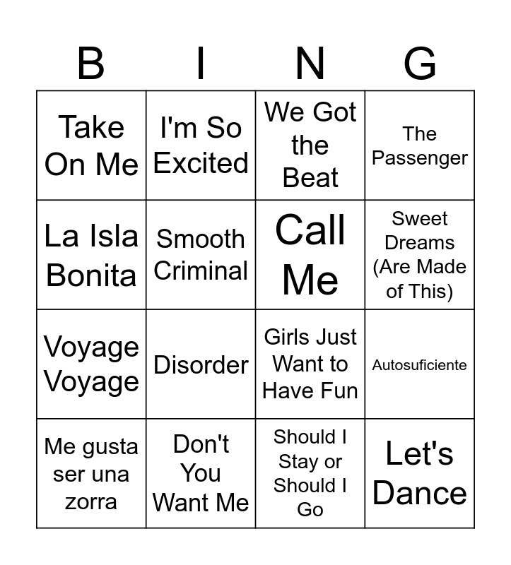 This bingo card has 25 words: Free!, Smalltown Boy, Sweet Dreams (Are Made of This), Enjoy the silence, La Isla Bonita, Take On Me, Smooth Criminal, I'm So Excited, Don't You Want Me, Maniac, Voyage Voyage, Girls Just Want to Have Fun, Flashdance... What a Feeling, I Love Rock'N Roll, Call Me, Bizarre Love Triangle, Should I Stay or Should I Go, We Got the Beat, Disorder, Autosuficiente, Me gusta ser una zorra, Perlas ensangrentadas, Let's Dance, The Passenger and My Sharona.