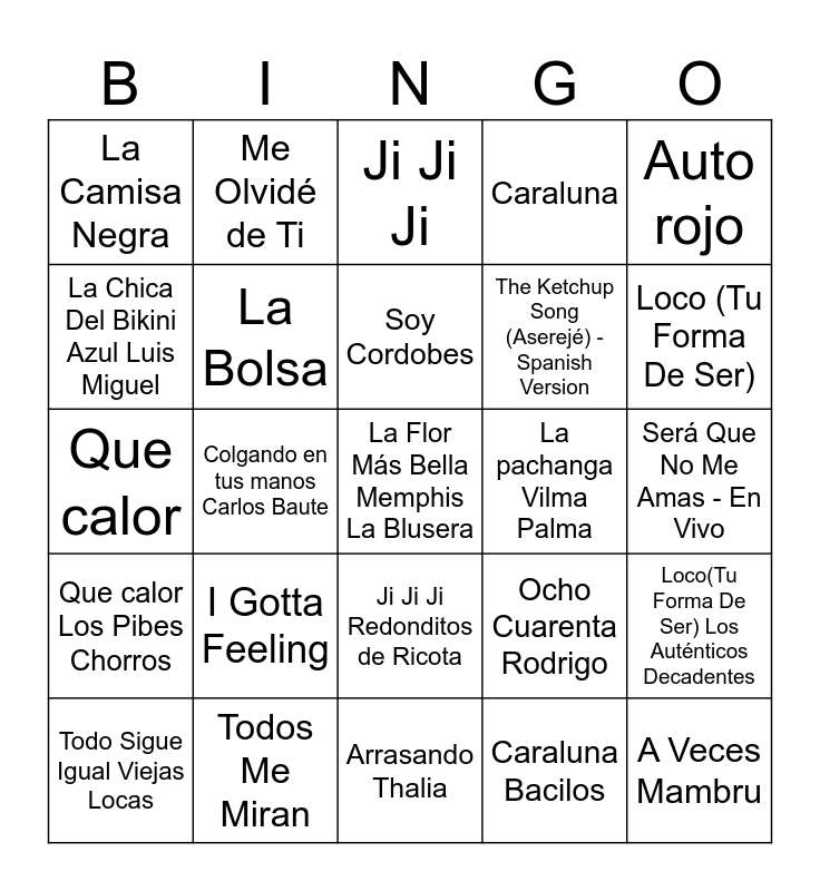 This bingo card has 178 words: Persiana Americana, De Música Ligera, La Flor Más Bella, La Guitarra, Loco (Tu Forma De Ser), Mariposa tecknicolor, El Matador, La Bifurcada, Mil Horas, Pasos Al Costado, Todo Sigue Igual, Campanas en la Noche, Ji Ji Ji, La pachanga, Auto rojo, Costumbres Argentinas, La Bolsa, Demoliendo Hoteles, Vasos Vacíos, Ahora Te Puedes Marchar, La Incondicional, Suave, Azul, Lloviendo Estrellas, Será Que No Me Amas - En Vivo, Me Voy, Colgando en tus manos (con Marta Sánchez), Mi Primer Millon, Caraluna, Salomé, Suavemente, Amor A La Mexicana, Arrasando, Procura, Gasolina, Lo Que Pasó, Pasó, Pobre Diabla, Obsesion, Salió El Sol, Rakata, La Camisa Negra, La Bicicleta, Ven Conmigo (Solamente Tú), Ciega, Sordomuda, Danza Kuduro, Waka Waka (Esto Es Africa) - K-Mix, Duraznito, La Ventanita, Nunca me faltes, El Bombón, Que calor, Beso a beso, Soy Cordobes, Ocho Cuarenta, No Me Arrepiento de Este Amor, Corazón Valiente, Una Calle Nos Separa, Dime si eres feliz, Y tu con el (aquí extrañandote), Mayonesa, El Tiburón, Me Olvidé de Ti, Livin' la Vida Loca, The Ketchup Song (Aserejé) - Spanish Version, Barbie Girl, Macarena, I Gotta Feeling, I Want It That Way, Everybody (Backstreet's Back) - Radio Edit, A Veces, Llega la Noche, Bailarina, Yegua - En Vivo, Para No Verte Más, Laura no està, La Chica Del Bikini Azul, Todos Me Miran, Olvídame y Pega la Vuelta, Yo No Soy Esa Mujer, Don, Que Nadie Sepa Mi Sufrir, Despacito, Ai Se Eu Te Pego, Propuesta Indecente, Como Alí, Por Mil Noches, Flores Amarillas, Gelatina, Coolo, Persiana Americana Soda Stereo, De Música Ligera Soda Stereo, La Flor Más Bella Memphis La Blusera, La Guitarra Los Auténticos Decadentes, Loco(Tu Forma De Ser) Los Auténticos Decadentes, Mariposa tecknicolor Fito Paez, El Matador Los Fabulosos Cadillacs, La Bifurcada Memphis La Blusera, Mil Horas Los Abuelos De La Nada, Pasos Al Costado Turf, Todo Sigue Igual Viejas Locas, Campanas en la Noche Los Tipitos, Ji Ji Ji Redonditos de Ricota, La pachanga Vilma Palma, Auto rojo Vilma Palma, Costumbres Argentinas Andrés Calamaro, La Bolsa Bersuit Vergarabat, Demoliendo Hoteles Charly García, Vasos Vacíos Los Fabulosos Cadillacs, Ahora Te Puedes Marchar Luis Miguel, La Incondicional Luis Miguel, Suave Luis Miguel, Azul Cristian Castro, Lloviendo Estrellas Cristian Castro, Será Que No Me Amas Luis Miguel, Me Voy Julieta Venegas, Colgando en tus manos Carlos Baute, Mi Primer Millon Bacilos, Caraluna Bacilos, Salomé Chayanne, Suavemente Elvis Crespo, Amor A La Mexicana Thalia, Arrasando Thalia, Procura ChiChi Peralta, Gasolina Daddy Yankee, Lo Que Pasó, Pasó Daddy Yankee, Pobre Diabla Don Omar, Obsesion Aventura, Salió El Sol Don Omar, Rakata Wisin & Yandel, La Camisa Negra Juanes, La Bicicleta Shakira, Ven Conmigo Christina Aguilera, Ciega, Sordomuda Shakira, Danza Kuduro Don Omar, Waka Waka Shakira, Duraznito Los Pibes Chorros, La Ventanita Grupo Sombras, Nunca me faltes Antonio Rios, El Bombón Los Palmeras, Que calor Los Pibes Chorros, Beso a beso La Mona Jimenez, Soy Cordobes Rodrigo, Ocho Cuarenta Rodrigo, No Me Arrepiento de Este Amor Gilda, Corazón Valiente Gilda, Una Calle Nos Separa Nestor En Bloque, Dime si eres feliz La Champions Liga, Y tu con el Grupo Play, Mayonesa Chocolate, El Tiburón Proyecto Uno, Me Olvidé de Ti 18 Kilates, Livin' la Vida Loca Ricky Martin, The Ketchup Las Ketchup, Barbie Girl Aqua, Macarena Los Del Rio, I Gotta Feeling Black Eyed Peas, I Want It That Way Backstreet Boys, Everybody Backstreet Boys, A Veces Mambru, Llega la Noche Bandana, Bailarina Miranda!, Yegua - Babasonicos, Para No Verte Más La Mosca, Laura no està Nek, La Chica Del Bikini Azul Luis Miguel, Todos Me Miran Gloria Trevi, Olvídame y Pega la Vuelta Pimpinela, Yo No Soy Esa Mujer Paulina Rubio, Don Miranda!, Que Nadie Sepa Mi Sufrir Soledad, Despacito Luis Fonsi, Ai Se Eu Te Pego Michel Teló, Propuesta Indecente Romeo Santos, Como Alí Los Piojos, Por Mil Noches Airbag, Flores Amarillas Floricienta, Gelatina Nietos del Futuro and Coolo Illya Kuryaki & The Valderramas.