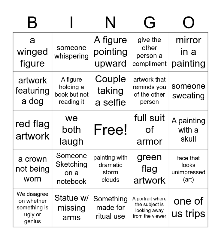 This bingo card has a free space and 24 words: Someone Sketching on a notebook, Statue w/ missing arms, Couple taking a selfie, We disagree on whether something is ugly or genius, mirror in a painting, a winged figure, artwork featuring a dog, someone whispering, full suit of armor, painting with dramatic storm clouds, artwork that reminds you of the other person, red flag artwork, green flag artwork, face that looks unimpressed (art), A figure holding a book but not reading it, A portrait where the subject is looking away from the viewer, A painting with a skull, A figure pointing upward, someone sweating, we both laugh, one of us trips, a crown not being worn, give the other person a compliment and Something made for ritual use.
