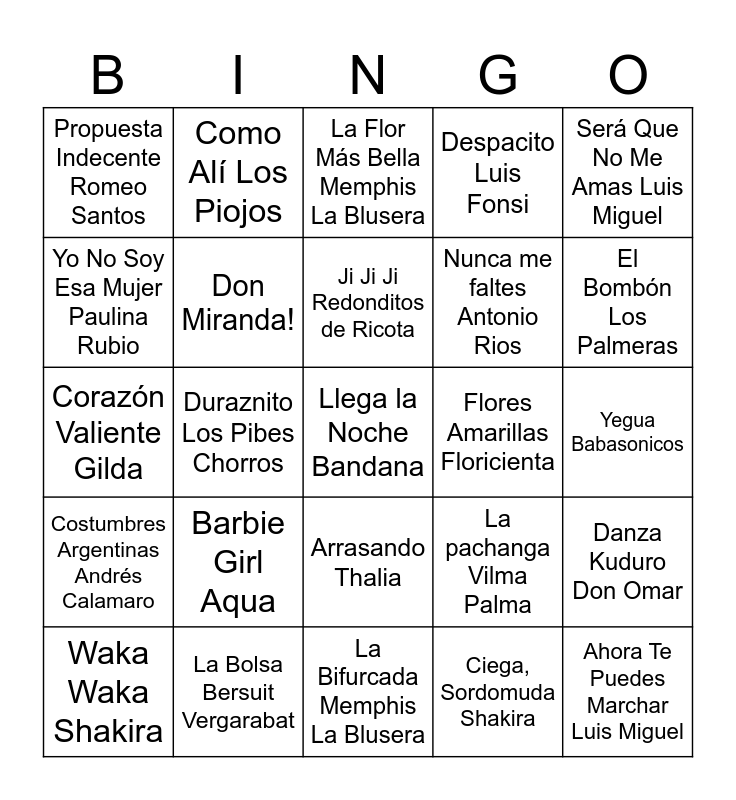 This bingo card has 89 words: Persiana Americana Soda Stereo, De Música Ligera Soda Stereo, La Flor Más Bella Memphis La Blusera, La Guitarra Los Auténticos Decadentes, Loco Los Auténticos Decadentes, Mariposa tecknicolor Fito Paez, El Matador Los Fabulosos Cadillacs, La Bifurcada Memphis La Blusera, Mil Horas Los Abuelos De La Nada, Pasos Al Costado Turf, Todo Sigue Igual Viejas Locas, Campanas en la Noche Los Tipitos, Ji Ji Ji Redonditos de Ricota, La pachanga Vilma Palma, Auto rojo Vilma Palma, Costumbres Argentinas Andrés Calamaro, Barbie Girl Aqua, Macarena Los Del Rio, I Gotta Feeling Black Eyed Peas, I Want It That Way Backstreet Boys, Everybody Backstreet Boys, A Veces Mambru, Llega la Noche Bandana, Bailarina Miranda!, Yegua Babasonicos, Para No Verte Más La Mosca, Laura no està Nek, La Chica Del Bikini Azul Luis Miguel, Todos Me Miran Gloria Trevi, Olvídame y Pega la Vuelta Pimpinela, Yo No Soy Esa Mujer Paulina Rubio, Don Miranda!, Que Nadie Sepa Mi Sufrir Soledad, Despacito Luis Fonsi, Ai Se Eu Te Pego Michel Teló, Propuesta Indecente Romeo Santos, Como Alí Los Piojos, Por Mil Noches Airbag, Flores Amarillas Floricienta, Gelatina Nietos del Futuro, Coolo Illya Kuryaki, La Bolsa Bersuit Vergarabat, Demoliendo Hoteles Charly García, Vasos Vacíos Los Fabulosos Cadillacs, Ahora Te Puedes Marchar Luis Miguel, La Incondicional Luis Miguel, Suave Luis Miguel, Azul Cristian Castro, Lloviendo Estrellas Cristian Castro, Será Que No Me Amas Luis Miguel, Me Voy Julieta Venegas, Colgando en tus manos Carlos Baute, Mi Primer Millon Bacilos, Caraluna Bacilos, Salomé Chayanne, Suavemente Elvis Crespo, Amor A La Mexicana Thalia, Arrasando Thalia, Procura ChiChi Peralta, Gasolina Daddy Yankee, Lo Que Pasó, Pasó Daddy Yankee, Pobre Diabla Don Omar, Obsesion Aventura, Salió El Sol Don Omar, Rakata Wisin & Yandel, La Camisa Negra Juanes, La Bicicleta Shakira, Ven Conmigo Christina Aguilera, Ciega, Sordomuda Shakira, Danza Kuduro Don Omar, Waka Waka Shakira, Duraznito Los Pibes Chorros, La Ventanita Grupo Sombras, Nunca me faltes Antonio Rios, El Bombón Los Palmeras, Que calor Los Pibes Chorros, Beso a beso La Mona Jimenez, Soy Cordobes Rodrigo, Ocho Cuarenta Rodrigo, No Me Arrepiento de Este Amor Gilda, Corazón Valiente Gilda, Una Calle Nos Separa Nestor En Bloque, Dime si eres feliz La Champions Liga, Y tu con el Grupo Play, Mayonesa Chocolate, El Tiburón Proyecto Uno, Me Olvidé de Ti 18 Kilates, Livin' la Vida Loca Ricky Martin and The Ketchup Las Ketchup.