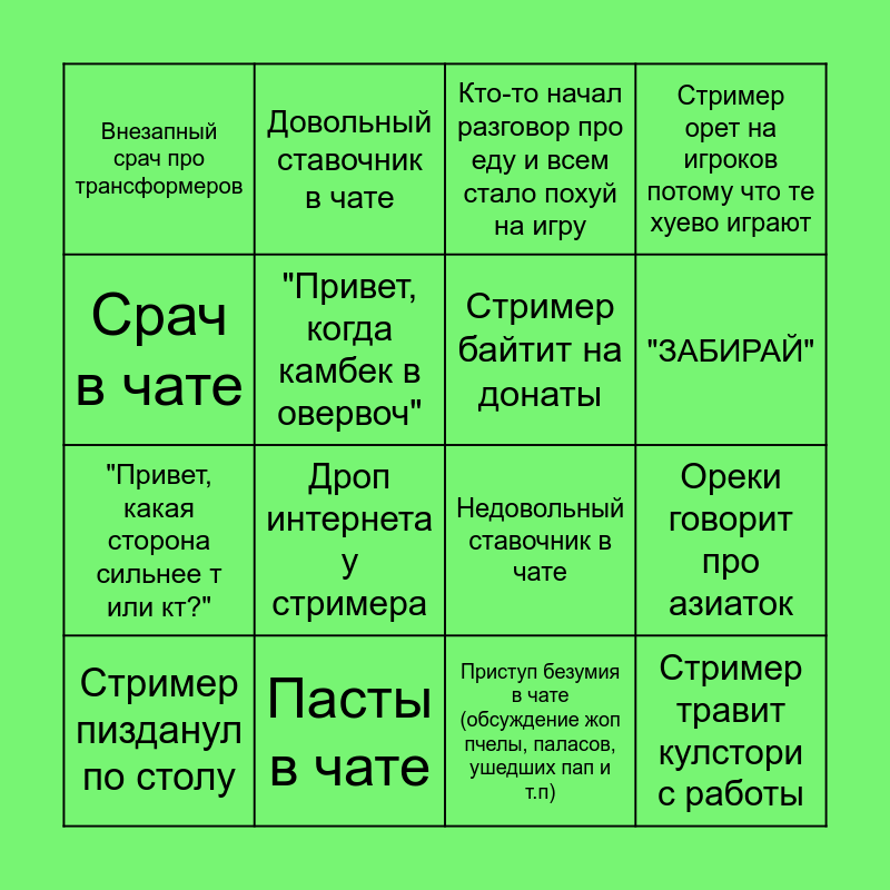 This bingo card has 16 words: Пасты в чате, Ореки говорит про азиаток, Кто-то начал разговор про еду и всем стало похуй на игру, Внезапный срач про трансформеров, "Привет, какая сторона сильнее т или кт?", Довольный ставочник в чате, Недовольный ставочник в чате, Приступ безумия в чате (обсуждение жоп пчелы, паласов, ушедших пап и т.п), Срач в чате, "Привет, когда камбек в овервоч", Стример пизданул по столу, Стример орет на игроков потому что те хуево играют, Дроп интернета у стримера, "ЗАБИРАЙ", Стример байтит на донаты and Стример травит кулстори с работы.