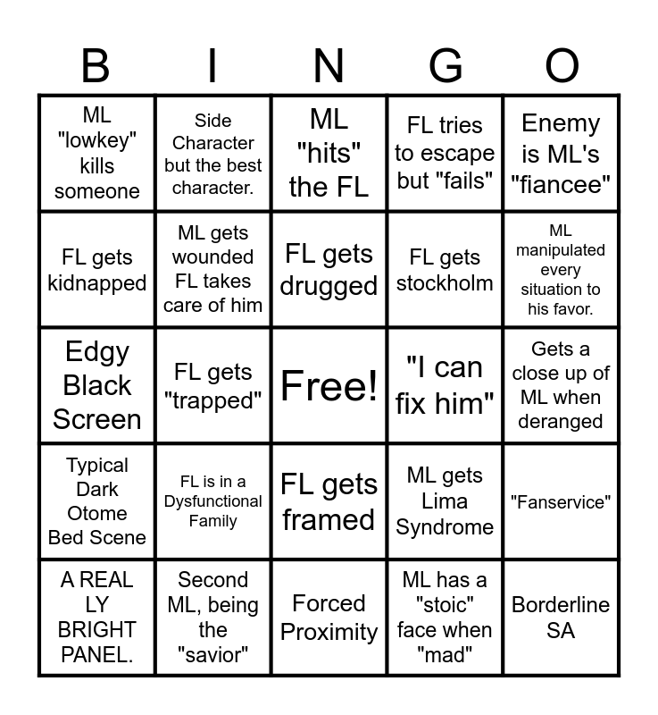 This bingo card has a free space and 24 words: FL is in a Dysfunctional Family, Second ML, being the "savior", FL gets drugged, A REALLY BRIGHT PANEL., Enemy is ML's "fiancee", ML "lowkey" kills someone, FL gets kidnapped, Side Character but the best character., "I can fix him", FL gets framed, FL gets stockholm, Edgy Black Screen, ML gets Lima Syndrome, "Fanservice", ML gets wounded FL takes care of him, ML has a "stoic" face when "mad", Gets a close up of ML when deranged, ML "hits" the FL, ML manipulated every situation to his favor., FL gets "trapped", Borderline SA, Typical Dark Otome Bed Scene, FL tries to escape but "fails" and Forced Proximity.