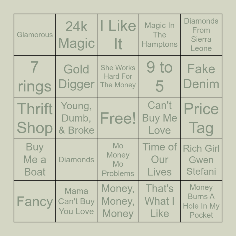 This bingo card has a free space and 34 words: Billionaire, Material Girl, I Need A Dollar, Money For Nothing, Price Tag, 7 rings, Gold Digger, Money, Money, Money, 9 to 5, Money Burns A Hole In My Pocket, Thrift Shop, 24k Magic, That's What I Like, Rich Girl, Buy Me a Boat, Young, Dumb, & Broke, Mo Money Mo Problems, Can't Buy Me Love, Rich Girl Gwen Stefani, Fancy, Mama Can't Buy You Love, Money Grabber, Magic In The Hamptons, Fake Denim, Beautiful People, Diamonds, I Like It, Candy Paint, Diamonds From Sierra Leone, Glamorous, No Scrubs, She Works Hard For The Money, Time of Our Lives and Can't Tell Me Nothing.