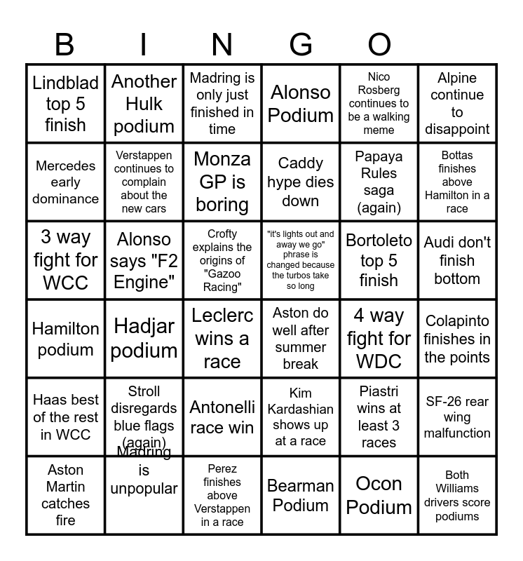This bingo card has 36 words: Kim Kardashian shows up at a race, Antonelli race win, Bearman Podium, Mercedes early dominance, Hamilton podium, "it's lights out and away we go" phrase is changed because the turbos take so long, Verstappen continues to complain about the new cars, Perez finishes above Verstappen in a race, Nico Rosberg continues to be a walking meme, Piastri wins at least 3 races, Bottas finishes above Hamilton in a race, Alonso Podium, SF-26 rear wing malfunction, Alonso says "F2 Engine", Caddy hype dies down, Lindblad top 5 finish, Haas best of the rest in WCC, Bortoleto top 5 finish, 3 way fight for WCC, Madring is only just finished in time, Crofty explains the origins of "Gazoo Racing", Hadjar podium, Aston do well after summer break, Leclerc wins a race, 4 way fight for WDC, Another Hulk podium, Papaya Rules saga (again), Madring is unpopular, Monza GP is boring, Alpine continue to disappoint, Both Williams drivers score podiums, Aston Martin catches fire, Colapinto finishes in the points, Audi don't finish bottom, Stroll disregards blue flags (again) and Ocon Podium.