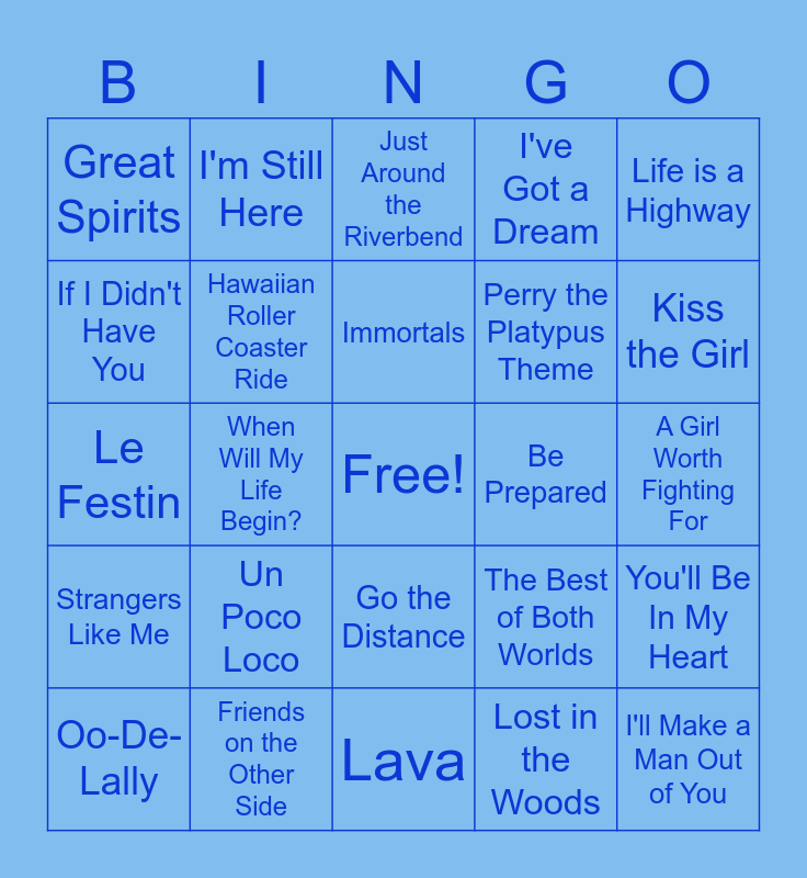 This bingo card has a free space and 37 words: I Just Can't Wait to Be King, How Far I'll Go, Zero to Hero, Hawaiian Roller Coaster Ride, You'll Be In My Heart, Un Poco Loco, Immortals, Almost There, Life is a Highway, Touch The Sky, When Will My Life Begin?, I've Got a Dream, I'll Make a Man Out of You, A Girl Worth Fighting For, If I Didn't Have You, Strangers Like Me, When Can I See You Again?, Just Around the Riverbend, Go the Distance, Be Prepared, Great Spirits, Kiss the Girl, Oo-De-Lally, Lava, Shiny, Lost in the Woods, I'm Still Here, Bop To The Top, Something There, On My Way, I Won't Say (I'm In Love), Friends on the Other Side, Le Festin, Everything Is Not As It Seems, The Best of Both Worlds, Perry the Platypus Theme and S.I.M.P.