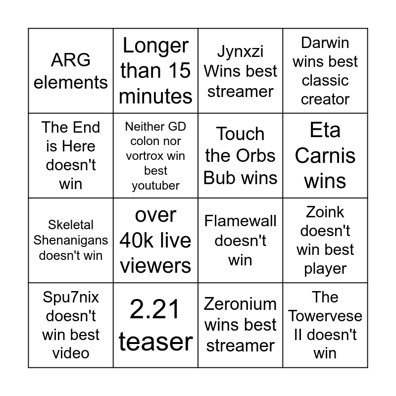 This bingo card has 16 words: 2.21 teaser, Zoink doesn't win best player, Jynxzi Wins best streamer, ARG elements, Skeletal Shenanigans doesn't win, Longer than 15 minutes, Flamewall doesn't win, Zeronium wins best streamer, The End is Here doesn't win, Neither GD colon nor vortrox win best youtuber, Spu7nix doesn't win best video, Darwin wins best classic creator, over 40k live viewers, Eta Carnis wins, Touch the Orbs Bub wins and The Towervese II doesn't win.
