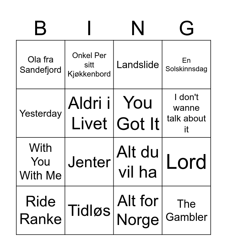 This bingo card has 44 words: Våren kommer nå, Ride Ranke, Cheerio, Spannish Steps, Venner, Bursdagssang, Landslide, House By The Sea, Yesterday, Take Me Home Country Roads, En Solskinnsdag, Tidløs, Forelska i Lærern, Sweet Caroline, Min første kjærlighet, Den finast eg veit, Forbuden Frukt, Alt du vil ha, Wind of Change, Jenter, Onkel Per sitt Kjøkkenbord, Bare så du vett det, Tore Tang, Ola fra Sandefjord, Kumbaya, my lord, Alt for Norge, Elleve mann med bein av stål, Gammal Drøm, Mamma Mia, The Gambler, Lemon Tree, Hit Me Baby One More Time, Min Drømmesang, To Fulle Menn, Lord, Wonderwall, En tur rundt i byen, Losing My Relegion, I don't wanne talk about it, Aldri i Livet, With You With Me, Idyll, You Got It and Can't Help Falling In Love.