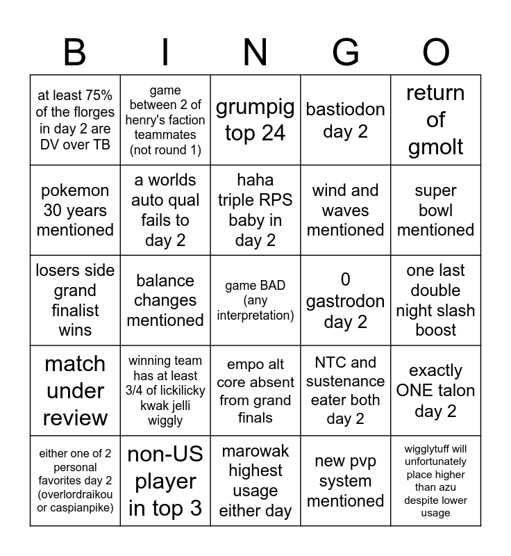 This bingo card has a free space and 24 words: winning team has at least 3/4 of lickilicky kwak jelli wiggly, non-US player in top 3, haha triple RPS baby in day 2, either one of 2 personal favorites day 2 (overlordraikou or caspianpike), return of gmolt, at least 75% of the florges in day 2 are DV over TB, pokemon 30 years mentioned, game between 2 of henry's faction teammates (not round 1), 0 gastrodon day 2, empo alt core absent from grand finals, wind and waves mentioned, losers side grand finalist wins, NTC and sustenance eater both day 2, exactly ONE talon day 2, a worlds auto qual fails to day 2, new pvp system mentioned, one last double night slash boost, grumpig top 24, super bowl mentioned, balance changes mentioned, wigglytuff will unfortunately place higher than azu despite lower usage, match under review, bastiodon day 2 and marowak highest usage either day.