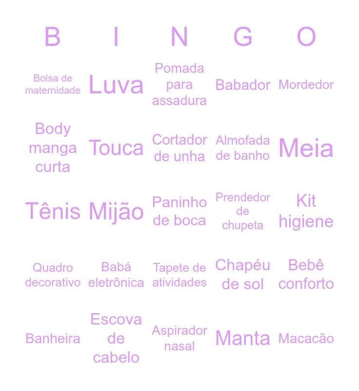 This bingo card has 74 words: Fralda descartável, Lenço umedecido, Pomada para assadura, Sabonete líquido, Shampoo infantil, Condicionador infantil, Colônia infantil, Toalha de banho, Banheira, Brinquedo de banho, Cotonete, Algodão, Cortador de unha, Body manga curta, Body manga longa, Mijão, Macacão, Meia, Sapatinho, Tênis, Touca, Luva, Babador, Fralda de pano, Paninho de boca, Mamadeira pequena, Mamadeira grande, Escova de mamadeira, Chupeta, Porta-chupeta, Mordedor, Pratinho, Colher de silicone, Copo de transição, Lençol de berço, Manta, Cobertor, Almofada de amamentação, Trocador portátil, Termômetro digital, Aspirador nasal, Escova de cabelo, Pente, Chocalho, Naninha, Bolsa de maternidade, Sling, Babá eletrônica, Protetor de seio, Absorvente para seio, Talco, Esponja de banho, Kit higiene, Lixeira de fraldas, Organizador de gaveta, Móbile, Tapete de atividades, Cadeirinha de descanso, Carrinho de bebê, Bebê conforto, Almofada de banho, Saboneteira, Quadro decorativo, Porta-fraldas, Prendedor de chupeta, Faixa de cabelo, Mordedor de água, Coletor de leite, Chapéu de sol, Mosquiteiro, Protetor de berço, Pote para papinha, Escova de dente de silicone and Mala de passeio.