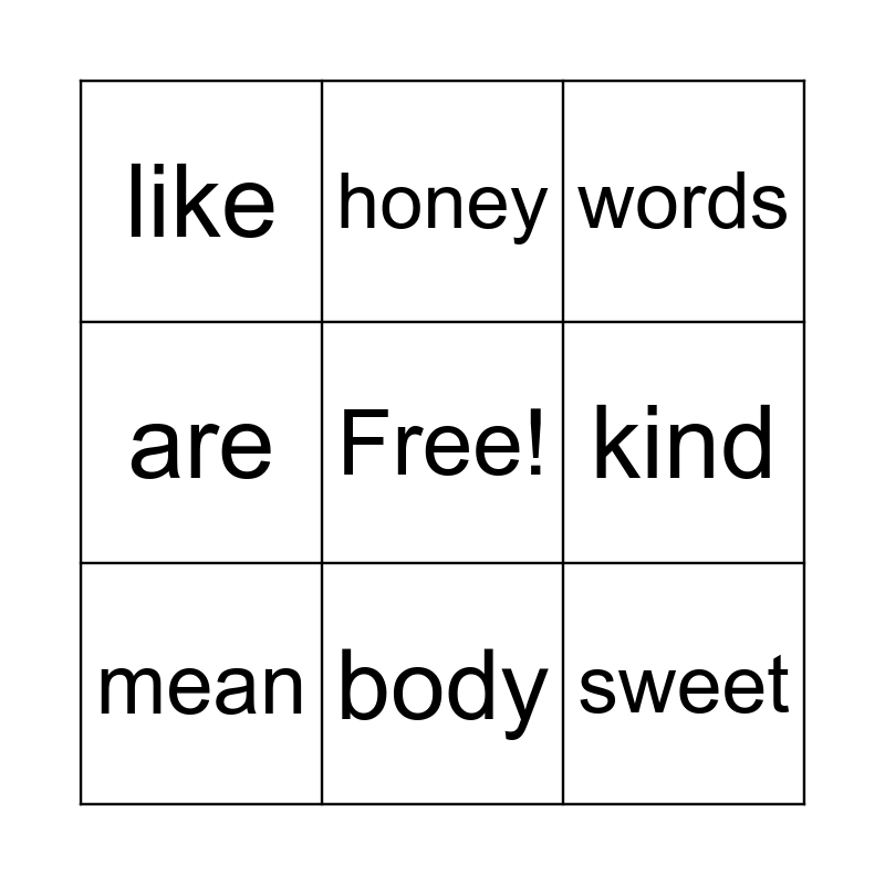 This bingo card has a free space and 8 words: kind, words, honey, mean, like, sweet, are and body.