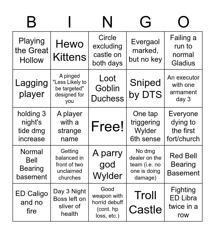 This bingo card has a free space and 58 words: Marais Executioner end of day 2, Day 3 Night Boss left on sliver of health, Teammate spams pings in rage, Normal Bell Bearing basement, Troll Castle, Quitting Teammate, A pinged "Less Likely to be targeted" designed for you, Sniped by an Archer Golem, Sniped by DTS, Killed by fall damage from an enemy, Evergaol marked, but no key, An executor who can't parry, A guardian running no shield, A revenant running colossals, Glitching out of the map (falling to death), Playing the Great Hollow, Fighting ED Libra twice in a row, Failing a run to normal Gladius, A clutch like no other (day 3 boss only), Loot Goblin Duchess, One tap triggering Wylder 6th sense, Circle excluding castle on both days, ED Caligo and no fire, Red Bell Bearing Basement, A mage Raider, Everyone dying to the first fort/church, A mage Wylder, A toxic Recluse, An executor with one armament day 3, Less than level 12 by day 3, Invader Ironeye running that fade (killing everyone), Troll trick shots you, Throwing pot Scholar, Grafted Sword end of day 2, Deal with Libra goes bad, Accidentally starting Libra's fight (day 1 & 2), Invader jump scares, A player with a strange name, holding 3 night's tide dmg increase, Gank fest in troll castle, Getting balanced in front of two unclaimed churches, Getting Frenzied Flame Ruin when balanced, No dmg dealer on the team (i.e. no one is doing damage), Having less than 600 hp by day 3, Not completing Noklateo in time, Killing the falling star beast in the meteor, Dying to Augur invasion (whole team), A parry god Wylder, Good weapon with horrid debuff (cont. hp loss, etc.), Raider ult blocking doorway, Fell Omen on weakest character, Guardian missing ult, Wylder missing ult, A Revenant clutch, Hewo Kittens, No map; can't find churches, Lagging player and Questioning what a weapon scales with.