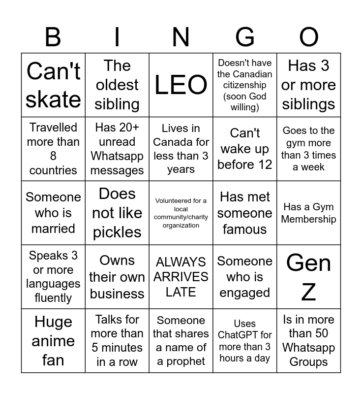 This bingo card has 25 words: Owns their own business, Someone that shares a name of a prophet, Lives in Canada for less than 3 years, Huge anime fan, Has 3 or more siblings, Can't skate, Travelled more than 8 countries, The oldest sibling, Has met someone famous, ALWAYS ARRIVES LATE, Can't wake up before 12, Someone who is married, Someone who is engaged, Gen Z, Has 20+ unread Whatsapp messages, Is in more than 50 Whatsapp Groups, Has a Gym Membership, LEO, Goes to the gym more than 3 times a week, Does not like pickles, Volunteered for a local community/charity organization, Talks for more than 5 minutes in a row, Speaks 3 or more languages fluently, Doesn't have the Canadian citizenship (soon God willing) and Uses ChatGPT for more than 3 hours a day.