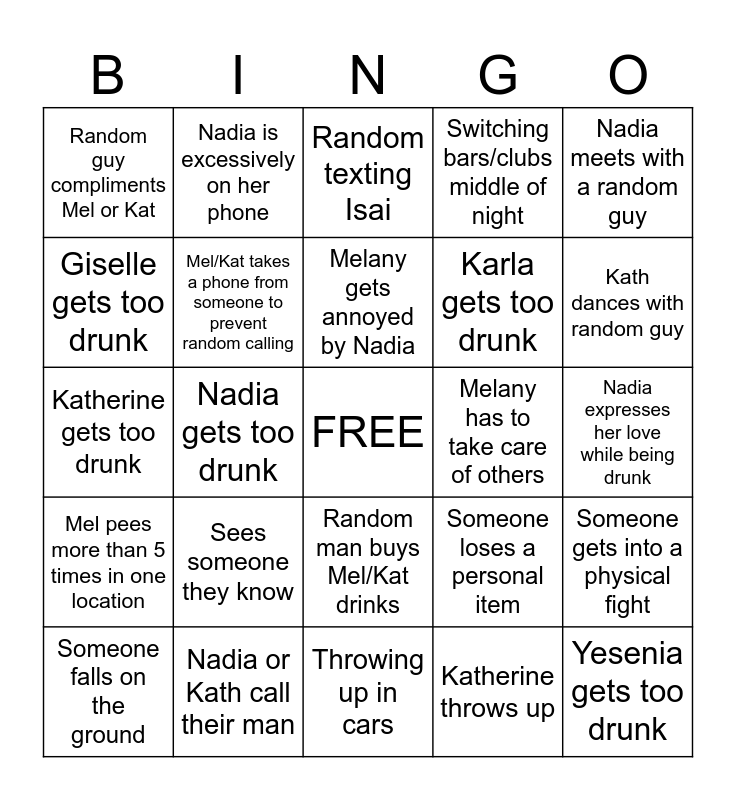This bingo card has a free space and 24 words: Sees someone they know, Nadia or Kath call their man, Melany gets annoyed by Nadia, Someone falls on the ground, Nadia meets with a random guy, Random guy compliments Mel or Kat, Giselle gets too drunk, Nadia is excessively on her phone, Melany has to take care of others, Random man buys Mel/Kat drinks, Karla gets too drunk, Katherine gets too drunk, Someone loses a personal item, Someone gets into a physical fight, Mel/Kat takes a phone from someone to prevent random calling, Katherine throws up, Nadia expresses her love while being drunk, Random texting Isai, Kath dances with random guy, Nadia gets too drunk, Yesenia gets too drunk, Mel pees more than 5 times in one location, Switching bars/clubs middle of night and Throwing up in cars.