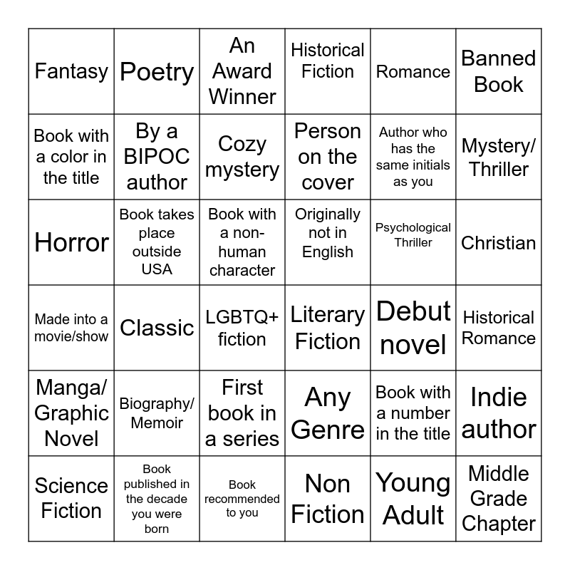 This bingo card has 36 words: Any Genre, First book in a series, Non Fiction, Book with a color in the title, Made into a movie/show, Originally not in English, By a BIPOC author, Book recommended to you, Romance, Book with a number in the title, Mystery/ Thriller, Historical Fiction, Indie author, Book takes place outside USA, Person on the cover, Fantasy, Manga/ Graphic Novel, Psychological Thriller, Horror, An Award Winner, Book with a non-human character, Classic, Literary Fiction, LGBTQ+ fiction, Debut novel, Poetry, Author who has the same initials as you, Book published in the decade you were born, Cozy mystery, Banned Book, Middle Grade Chapter, Science Fiction, Historical Romance, Christian, Biography/ Memoir and Young Adult.