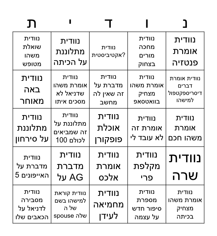 This bingo card has a free space and 24 words: נוודית מדברת על AG, נוודית קוראת למישהו בשם של ה spouse שלה, נוודית מדברת על זה שאין לה מחשב, נוודית מסבירה לדניאל על הכאבים שלו, נוודית אומרת פנטזיה, נוודית שואלת משהו מטופש, נוודית באה מאוחר, נוודית מתלוננת על הכיתה, נוודית אומרת זה לא עובד לי, נוודית אומרת אלכס, נוודית אומרת משהו מצחיק בוואטסאפ, נוודית מתלוננת על סירחון, נוודית מקלפת פרי, נוודית שרה, נוודית אומרת משהו שדניאל לא מסכים איתו, נוודית מספרת סיפור חדש על עצמה, נוודית אומרת משהו חכם, נוודית אקטיביסטית?, נוודית אומרת דברים דיסריספקטפול למישהו, נוודית מתלוננת על זה שמביאים לכולם 100, נוודית אומרת משהו מצחיק בכיתה, נוודית מדברת על 5 האייפונים, נוודית מחכה מורים בצחוק and נוודית מחמיאה לעידן.