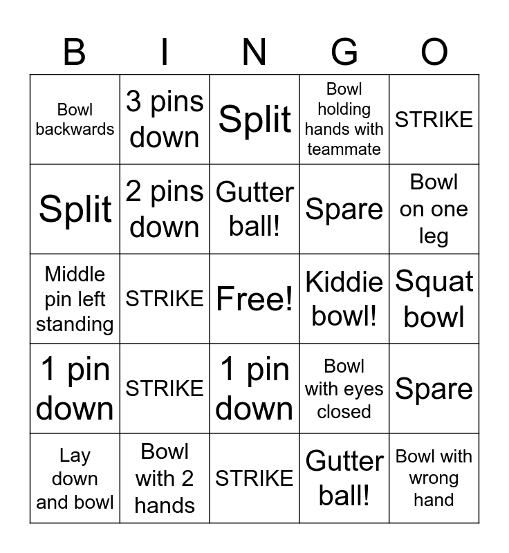 This bingo card has a free space and 24 words: STRIKE, Bowl with 2 hands, Gutter ball!, Lay down and bowl, STRIKE, Bowl backwards, Split, 3 pins down, Kiddie bowl!, 1 pin down, Spare, Middle pin left standing, Bowl with eyes closed, Spare, 2 pins down, Gutter ball!, Squat bowl, Split, Bowl on one leg, STRIKE, Bowl with wrong hand, 1 pin down, Bowl holding hands with teammate and STRIKE.
