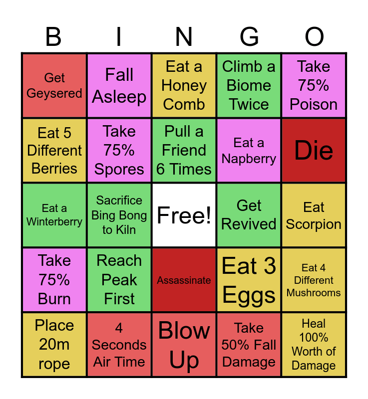 This bingo card has a free space and 34 words: Cook a Spawn Item at 2 Different Fires, Take 50% Fall Damage, Take 75% Freeze, Loose Consciousness, Take 75% Burn, Take 75% Spores, Take 75% Poison, Place 20m rope, Fall Asleep, Find Mandrake, Pull a Friend 6 Times, Eat a Honey Comb, Assassinate, Revive a Friend, Get Revived, Die, 4 Seconds Air Time, Eat a Winterberry, Reach Peak First, Eat 3 Eggs, Assassinate, Jump Into Volcano, Get Geysered, Eat Scorpion, Blow Up, Heal 100% Worth of Damage, Climb a Biome Twice, Eat a Friend and Revive Them, Eat a Napberry, Eat 5 Different Berries, Use 3 Balloons at Once, Sacrifice Bing Bong to Kiln, Eat 4 Different Mushrooms and Survive Certain Death.
